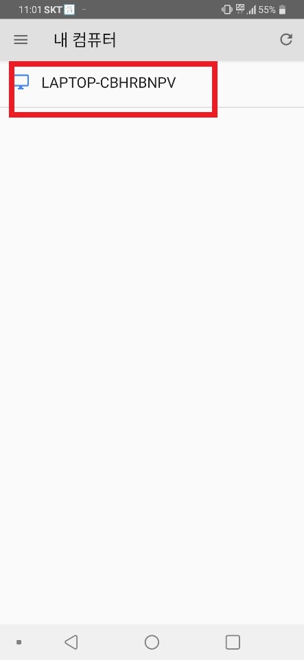 크롬 원격 데스크톱 어플로 접속 하시면 위와 같은 화면이 나옵니다. 여기서 자신이 연결하려는 컴퓨터 이름을 찾아 클릭해줍니다. 지금은 하나만 연결되있기 때문에 데스크탑에서 설정했던 이름이 나와있습니다.