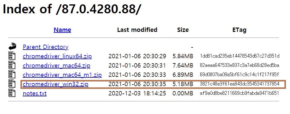 아까 위에서 크롬 정보를 확인했던 버전에 맞춰서 다운로드 받으셔야 됩니다. 전 87버전이라서 가운데 있는 크롬 드라이버를 클릭했습니다.
