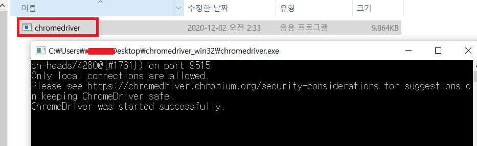 압축을 풀면 크롬드라이버가 설치된 것을 확인 하실 수 있습니다. 파일을 클릭해보시면 크롬드라이버가 성공적으로 시작된다 뭐 이런 식으로 나옵니다. 사용하실 때 파일은 구지 여실 필요가 없고 크롤링 하실려는 파일과 같은 위치에 있어야되니 참고하시길 바랍니다.