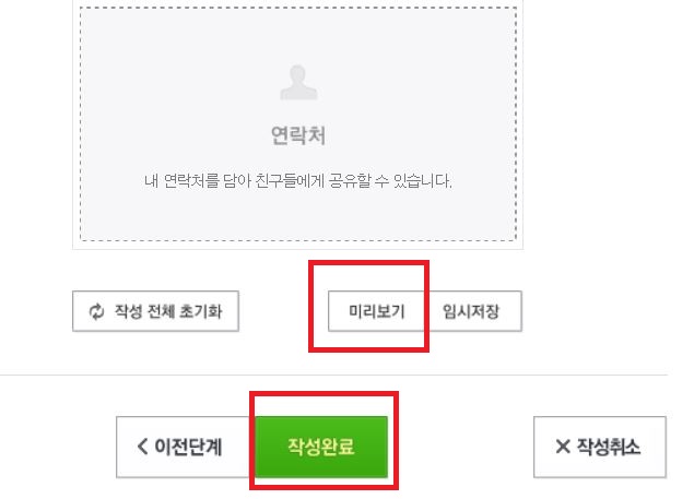 마지막으로 연락처를 넣을 수 있습니다. 미리보기를 통해 QR코드 스캔 화면을 보실 수 있고 다 하셨으면 작성완료 버튼을 눌러줍니다.