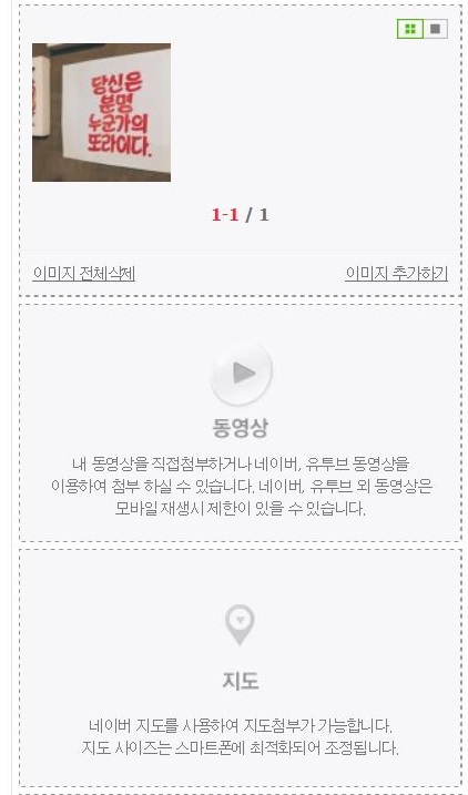 밑으로 내려주시면 그림과 동영상, 지도 도 첨부하실 수 있습니다. 저는 먼저 이미지만 넣어봤습니다.