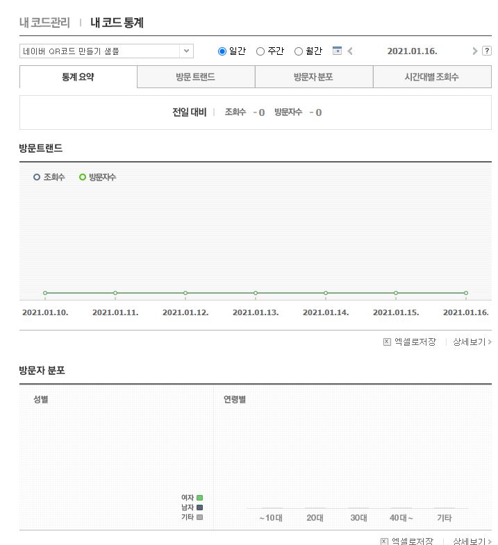 QR코드를 만들면 QR코드를 사람들이 얼마나 클릭했는지 확인하실 수도 있습니다. 먼저 위에 카테고리에서 내 코드관리를 눌러줍니다. 생성된 QR코드가 보이고 오른쪽에 상세보기를 눌러줍니다.