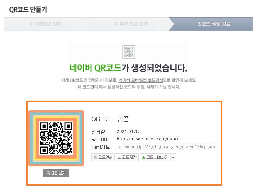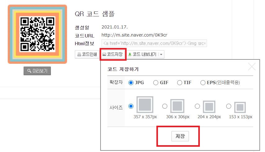 코드 저장을 누르시면 옆에 보이는 QR코드 화면을 이미지 파일로 저장하실 수 있습니다.