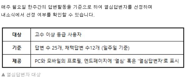 마지막으로 열심답변자에 대해 알아보겠습니다. 열심답변자란 한주간에 답변활동을 기준으로 월요일에 선정됩니다. 열심답변자 대상은 고수 이상 등급자 이고 일주일 기준으로 답변 수는 25개에 채택답변 수는 12개를 받으시면 됩니다. 지식인 답변을 달때 옆에 열심 또는 열심답변자라고 표시가 나옵니다. ㅎㅎ 이렇게 나오면 질문자 입장에서도 조금더 신뢰가 갈거같습니다~