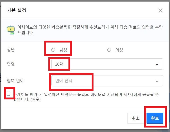 처음 아케이드로 접속하시면 정보를 입력하셔야 합니다. 자신의 정보에 맞게 성별과 연령 참여 언어를 선택하시고 완료를 눌러줍니다. 영어를 잘못하긴 하지만 다른 영어보다는 조금이라도 알기 때문에 저는 참여 언어를 영어를 선택했습니다. 만약 다른 언어에 자신이 있으시면 그 언어를 선택하셔도 됩니다.