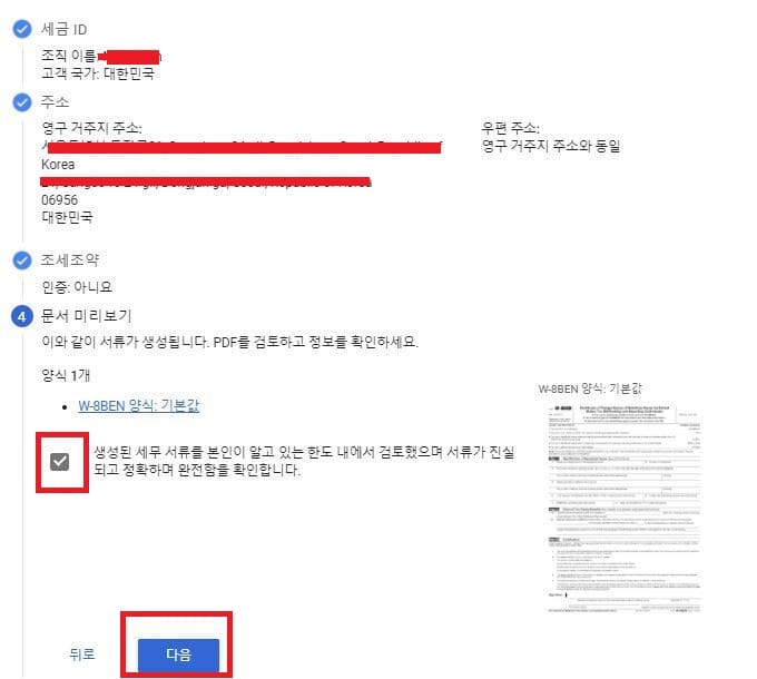 다음으로 생성된 세무 서류를 본인이 알고 있는 한도 내에서 검토했으며 서류가 진실되고 정확하며 완전함을 확인합니다에 체크를 하시고 다음을 눌러줍니다.