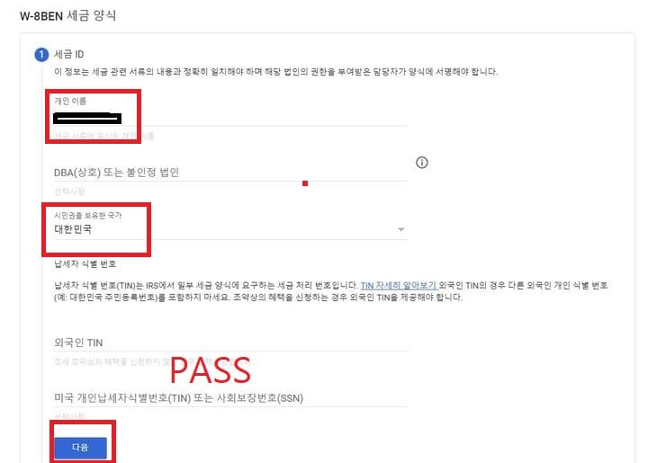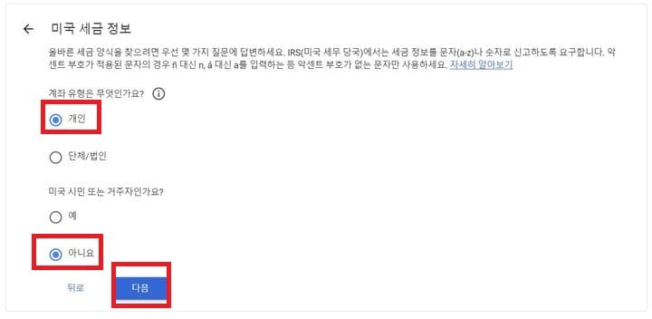 다음으로 미국 시민 또는 거주자 인가요? 답변에서 아니오를 눌러줍니다. 혹시 저랑 다르신 분은 다른 방법을 찾아보시길 바랍니다...저는 미국 시민 아니고 한국에서 살고 개인이고 수익이 많지 않은 편입니다.