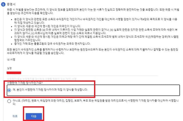 서명란에 실명을 작성해주시고 서명란에 기재된 사람이 당사자라는 질문에 예를 누르시고 다음을 눌러줍니다.