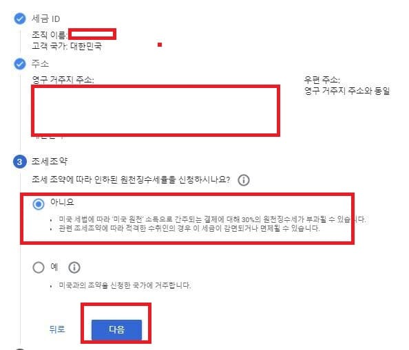 그리고 마지막으로 세금 ID 섹션에서 확인된 개인이나 법인이 미국 내에서 Google에 대한 활동 및 서비스를 수행했나요 에서 아니오를 선택하고 아래 박스를 체크하시고 다음 질문은 이전에 대금을 지급 받은 기존 결제 프로필의 세금 정보를 누르시고 아래 질문에 체크를 하시고 제출을 눌러줍니다.