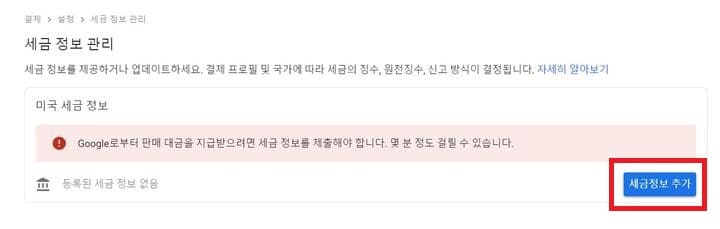 세금 정보 관리에서 세금 정보 추가를 눌러줍니다.