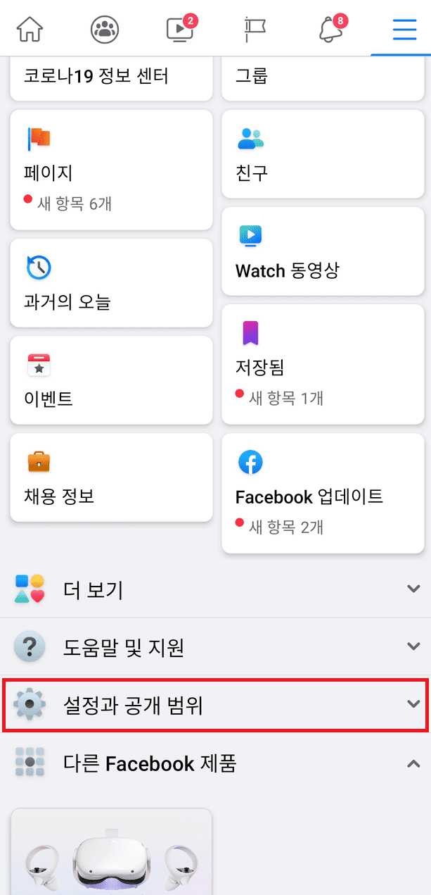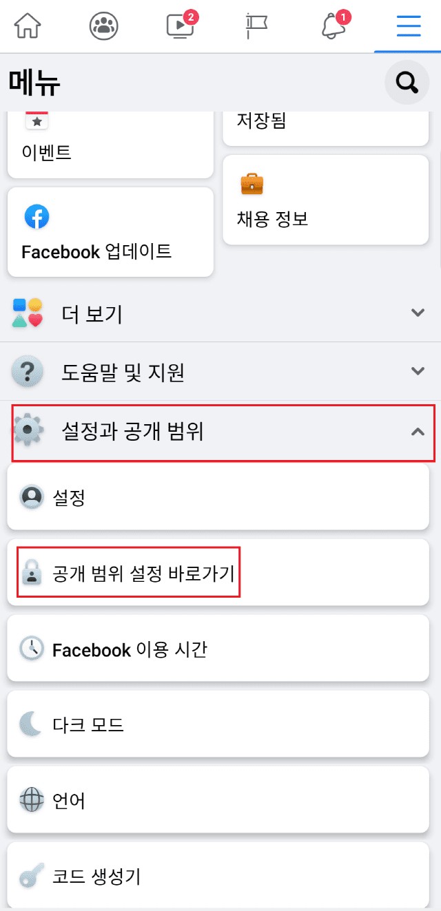 몇가지 메뉴들이 있고 아래 보이는 설정과 공개 범위를 눌러줍니다.