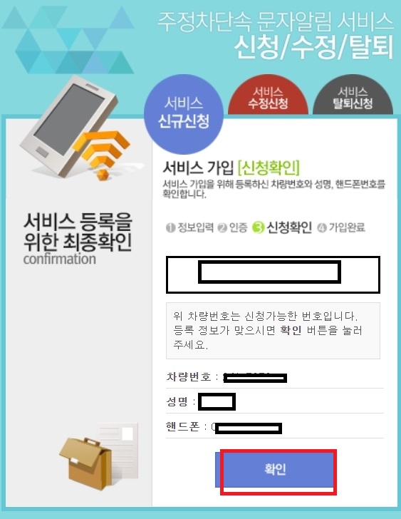 인증을 완료하시면 차량번호와 자신의 성명, 핸드폰 번호가 맞는지 확인하시고 확인을 눌러줍니다.