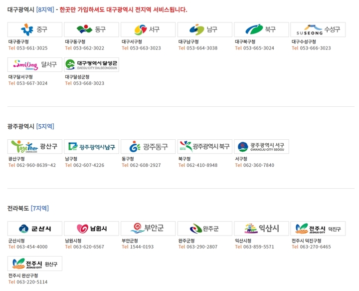 대구지역 8곳, 광주지역 5곳, 전라북도 지역 7곳이 있습니다. 대구지역은 한곳만 가입하셔도 대구전지역에서 서비스가 가능합니다.
