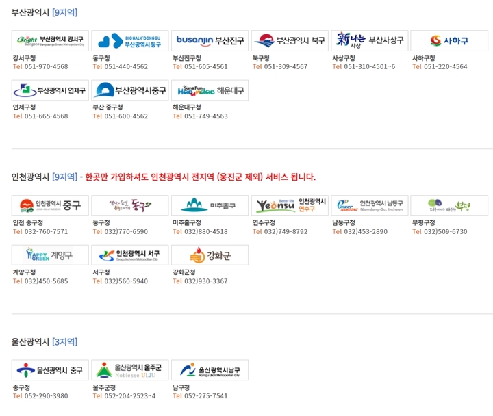 부산지역 9곳, 인천지역 9곳, 울산지역 3곳이 있습니다. 인천도 웅진군을 제외하고 한곳에서 가입하셔도 전지역 서비스가 가능합니다.