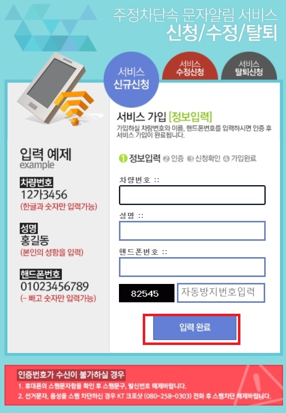 다음으로 서비스 가입 페이지가 나옵니다. 가입하고 싶은 자신의 차량번호, 성명, 핸드폰 번호만 입력하시면 간단하게 가입이 가능합니다.