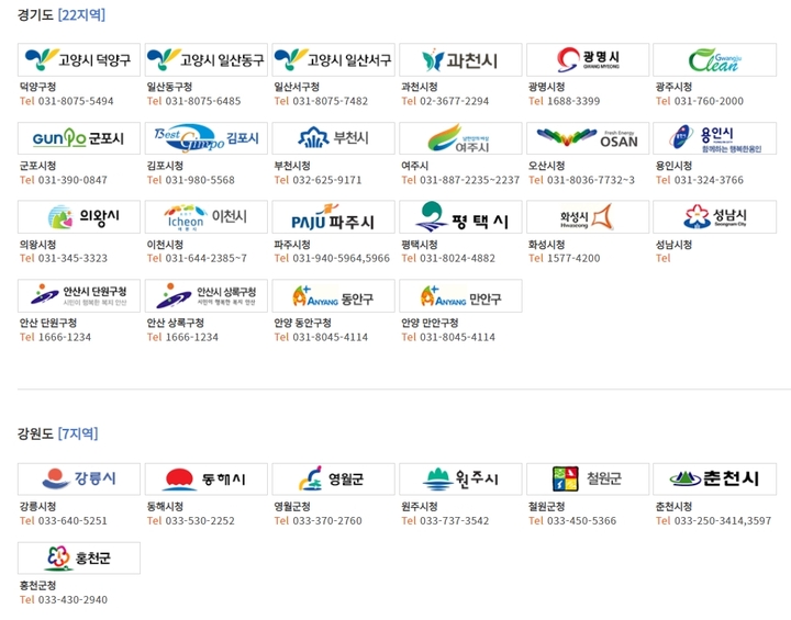 경기도와 강원도는 각각 22개 지역과 7개 지역이 있습니다.