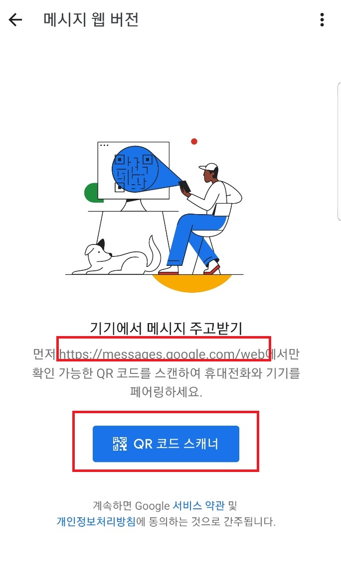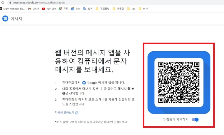 웹사이트에 보시면 이런 QR코드 스캔 화면이 있습니다. 여기서 이 컴퓨터 기억하기를 오른쪽으로 눌러주시고 핸드폰에서 메시지 스캐너를 이용해 스캔을 해줍니다.