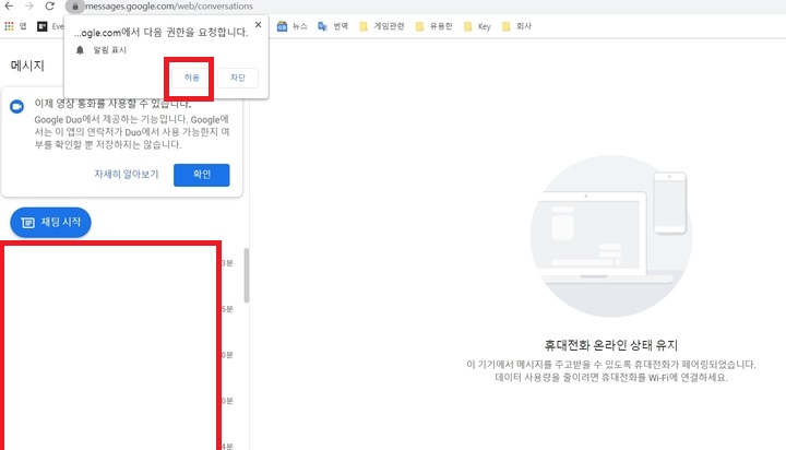 스캔을 완료하시면 이제 컴퓨터에서 핸드폰 문자 메시지를 보내실 수 있습니다. 구글에서 다음 권한을 요청합니다라는 팝업이 나오면 허용을 해주시면 됩니다. 그리고 채팅 시작을 누르면 문자 메시지를 보내실 수 있습니다.