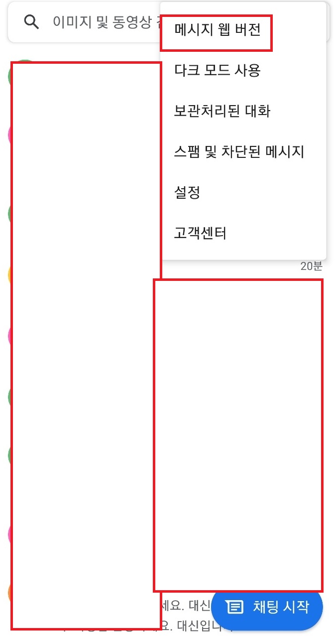 처음에는 동기화가 안되서 빈 화면으로 나올거에요. 하지만 다시 접속하면 핸드폰 문자에 있는 메시지들이 다 나올거에요, 일단 컴퓨터랑 연결하기 위해서는 오른쪽 상단에 점 세개 버튼을 눌러줍니다.