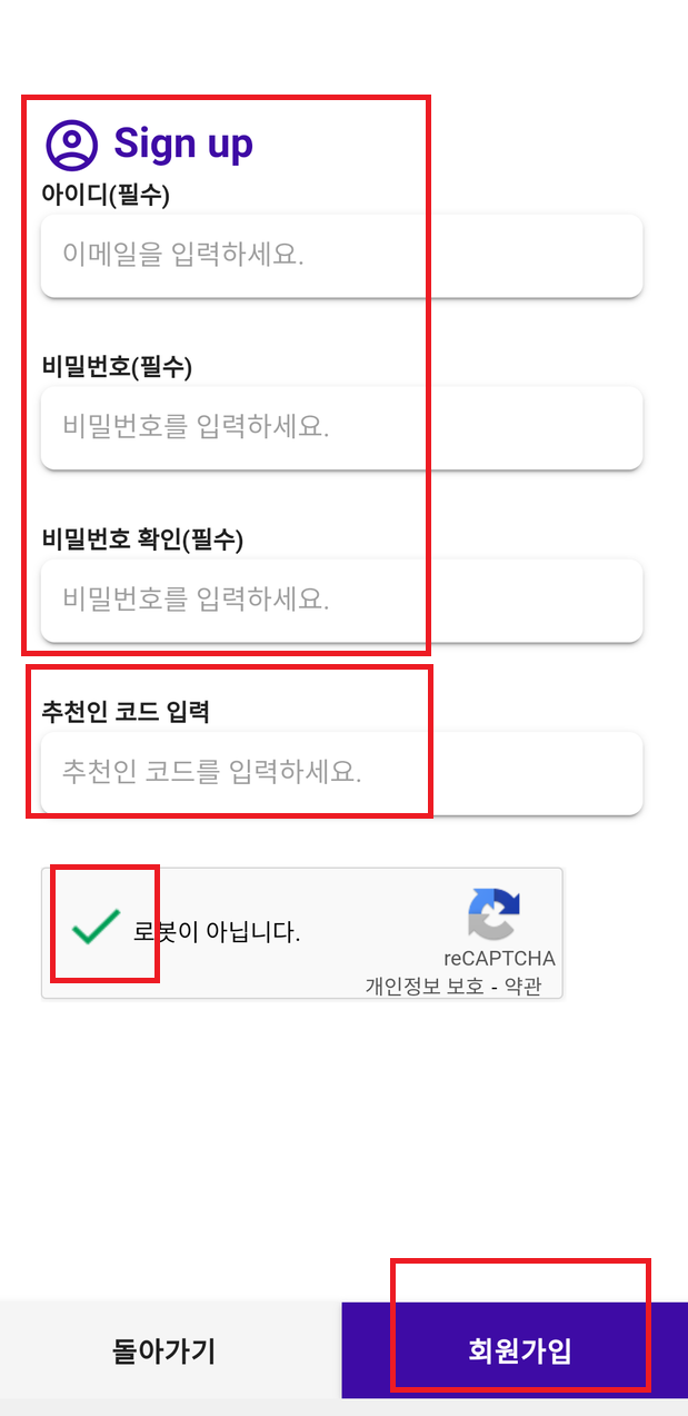 페이캄 월렛에서는 별도의 본인인증 없이 이메일만으로도 회원가입을 하실 수 있습니다. 가입하려는 이메일과 비밀번호를 누르시고 로봇이 아닙니다를 체크 하신 후 추천인도 입력해줍니다.