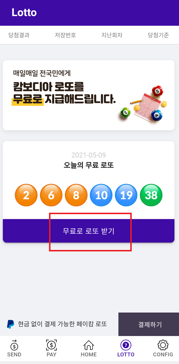 무료로또받기를 누르시면 위와 같은 화면이 나옵니다. 여기서 캄보디아 로또 무료 지급에 동의합니다를 클릭하시고 무료로 로또 받기를 눌러줍니다.