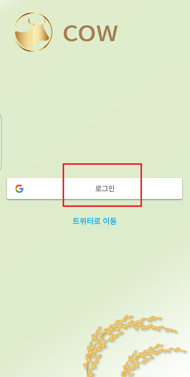 다운로드 받은 카우카우 코인을 실행 하시면 위와 같은 화면이 나옵니다. 뭔가 화려하거나 그런 화면은 아니더라구요. 트위터로 이동을 누르시면 카우카우 코인 소식에 대해 알아볼 수 있습니다. 회원가입하는 방법은 구글 계정을 통해 가입이 가능해서 구글 로그인을 눌러줍니다.