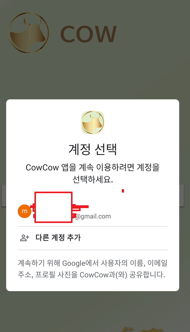 구글 로그인을 누르면 자신의 구글 계정을 선택하는 화면이 나옵니다. 여기서 자신이 가입하려는 구글 계정을 눌러줍니다.