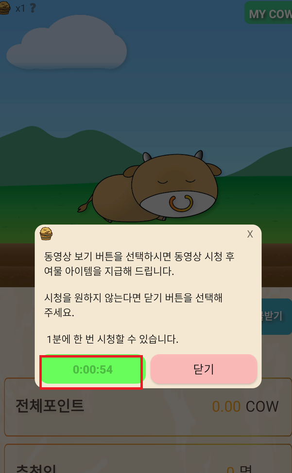 동영상 보기를 누르고 나오면 다음 쿨 타임까지 1분이 걸리는 것을 확인하실 수 있습니다.