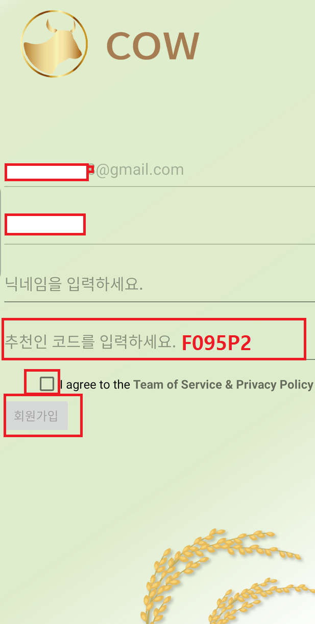 구글 계정의 이메일과 이름을 확인하시고 가입하실 닉네임을 설정해줍니다. 그리고 추천인을 넣어주신 후 F095P2