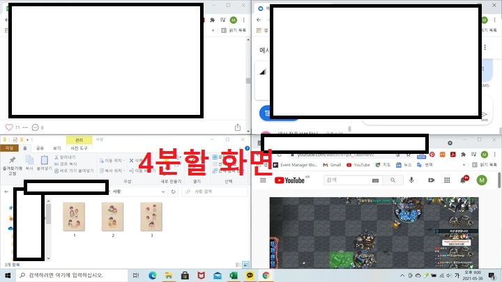마지막으로 4분할 화면 입니다. 3분할과 똑같이 분할이 안된 쪽을 누르신 후 3분할 처럼 윈도우키 + 방향키를 아래쪽이나 위쪽으로 눌러주시면 됩니다. 그리고 켜져있는 프로그램 중 원하는 것을 클릭해주시면 그 화면이 4분할로 나오게 됩니다.