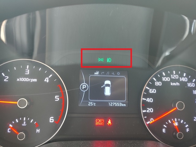 안개등과 미등을 켠 상태입니다. 오른쪽이 안개등이고 왼쪽이 미등입니다. 미등과 전조등을 켰을때는 아이콘이 똑같이 나오니 참고하시길 바랍니다. 안개등은 눈이나 비가 오거나 안개가 많이 끼거나 흐린 날씨에 시야가 잘 확보되지 않을 때 사용하는 라이트 입니다. 아래 라이트가 위치한 것 처럼 보조 라이트라고 생각하시면 됩니다. 전조등보다 더 가까운 도로를 비추어서 도로 상태를 확인하기 좋고 다른 운전자들이 자신의 차량 위치를 잘 확인할 수 있습니다.